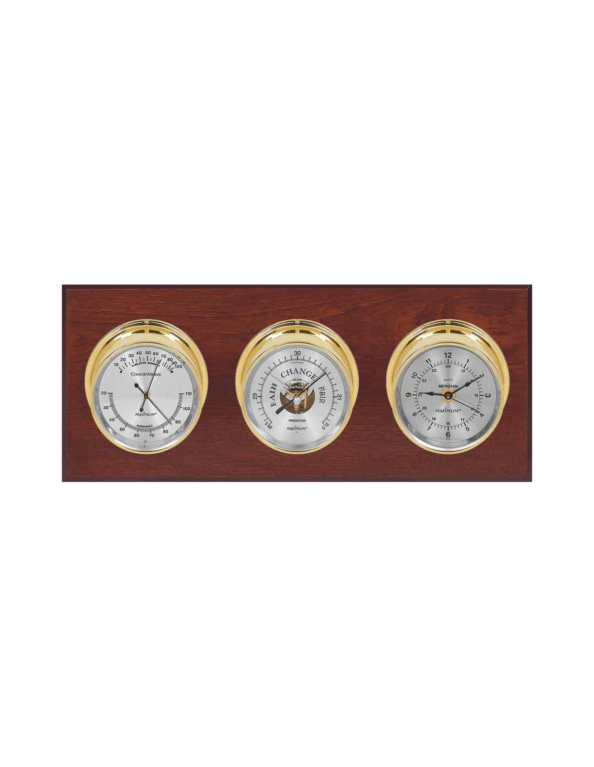 The Executive is a ready-to-use home weather station that blends elegance and function. It includes the ComfortMinder, Predictor, and Meridian instruments, beautifully mounted on your choice of oak or mahogany. Designed for simplicity, the Executive requires no external sensors or power supplies — delivering accurate readings of temperature, humidity, barometric pressure, and tides right out of the box. Perfect for homeowners and weather enthusiasts alike, it offers a refined way to monitor everyday weather conditions with the craftsmanship and reliability Maximum is known for. (Please specify altitude if installation is above 2,000 feet for coarse adjustment.)
