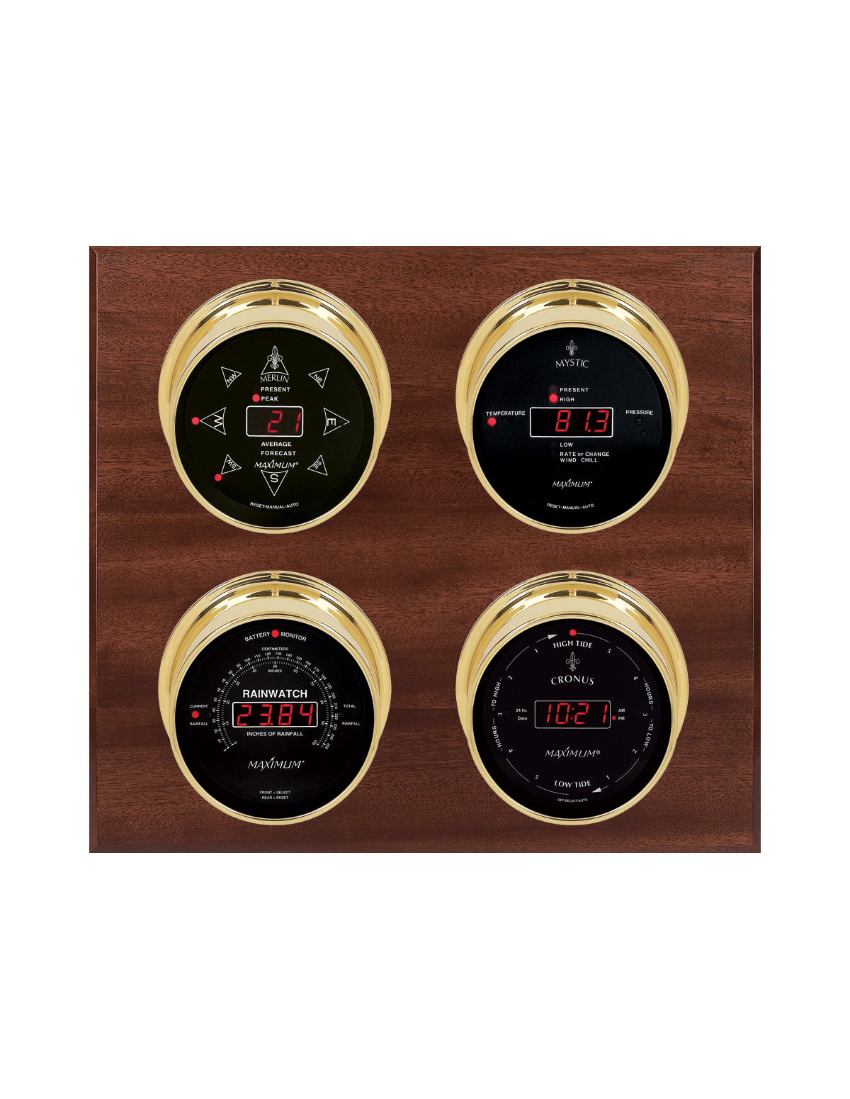 The Marconi makes it easy and enjoyable to stay informed about your local weather with digital precision and classic design. This popular 4-instrument home weather station (Merlin, Mystic, Rainwatch, and Cronus) displays wind speed and direction, outdoor temperature, wind chill, barometric pressure, rainfall, and even time and East Coast tide. Mounted on an elegant 4-instrument panel, the Marconi combines modern functionality with Maximum’s trusted craftsmanship, offering a complete and reliable weather-tracking experience for any home or coastal environment. (Please specify altitude if installation is above 2,000 feet for coarse adjustment.)