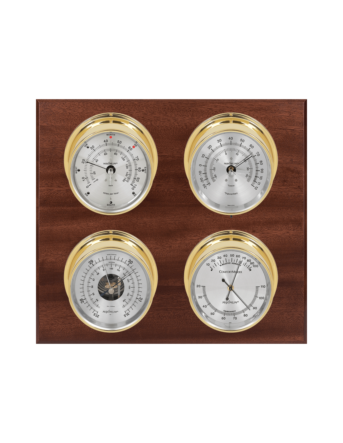 The Observer delivers a wealth of weather insights in a refined 4-instrument display (Maestro, Mini-Max, Proteus, and ComfortMinder). This classic home weather station measures wind speed and direction, outdoor and indoor temperature, relative humidity, and barometric pressure, allowing you to track five key weather conditions at a glance. Crafted with Maximum’s renowned precision and timeless design, the Observer blends functionality and elegance, making it a perfect centerpiece for any home, office, or coastal space. (Please specify altitude if installation is above 2,000 feet for coarse adjustment.)