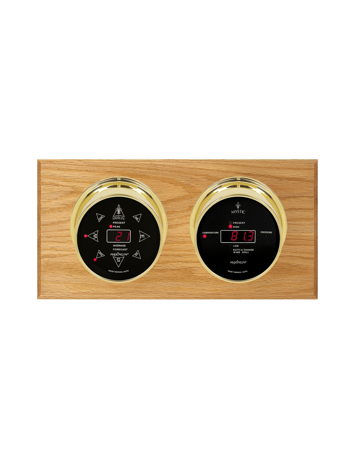 Get the most weather insight in the least amount of space with the Sorcerer, a compact yet powerful home weather station. This dual-instrument (Merlin and Mystic) display tracks four local weather conditions — wind speed and direction, barometric pressure, wind chill, and outdoor temperature — delivering precise readings at a glance. Built with the same craftsmanship found across all Maximum weather instruments, the Sorcerer combines efficiency, accuracy, and timeless design, making it ideal for homes, offices, or coastal settings where space is limited but performance matters. (Please specify altitude if installation is above 2,000 feet for coarse adjustment.)